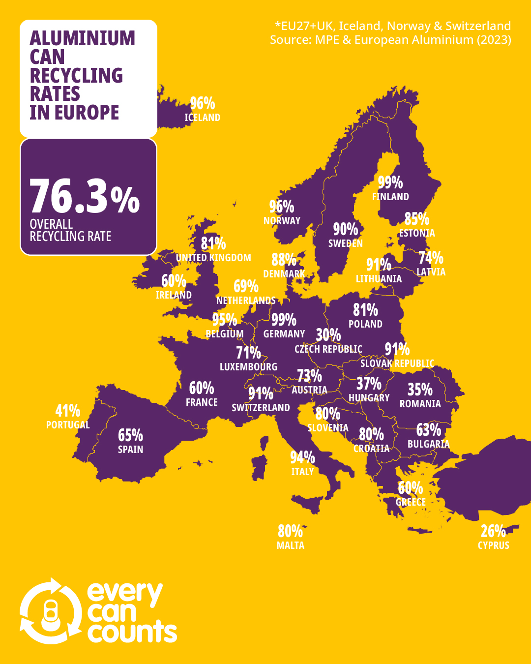 Bruksela, 17 lutego 2026 – Najnowszy raport Metal Packaging Europe (MPE) i European Aluminium (EA) pokazuje, że ogólny wskaźnik recyklingu aluminiowych puszek po napojach w Unii Europejskiej, Wielkiej Brytanii, Szwajcarii, Norwegii i Islandii osiągnął 76,3% w 2023 roku.